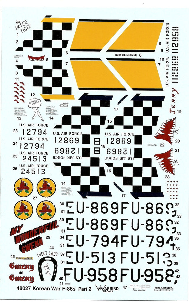 Warbird Decals 48027. Factory sealed; ziplocked. Markings for five aircraft; 'Gweny', Jabara's F-86F, 'The Paper Tiger/Heaven's Above', 'Jerry/My Wonderful Gwenn' and 'Lucky Lady'. Rare subjects. Hard decal set to find in hobby shops. Excellent quality decal set. See scans for details.