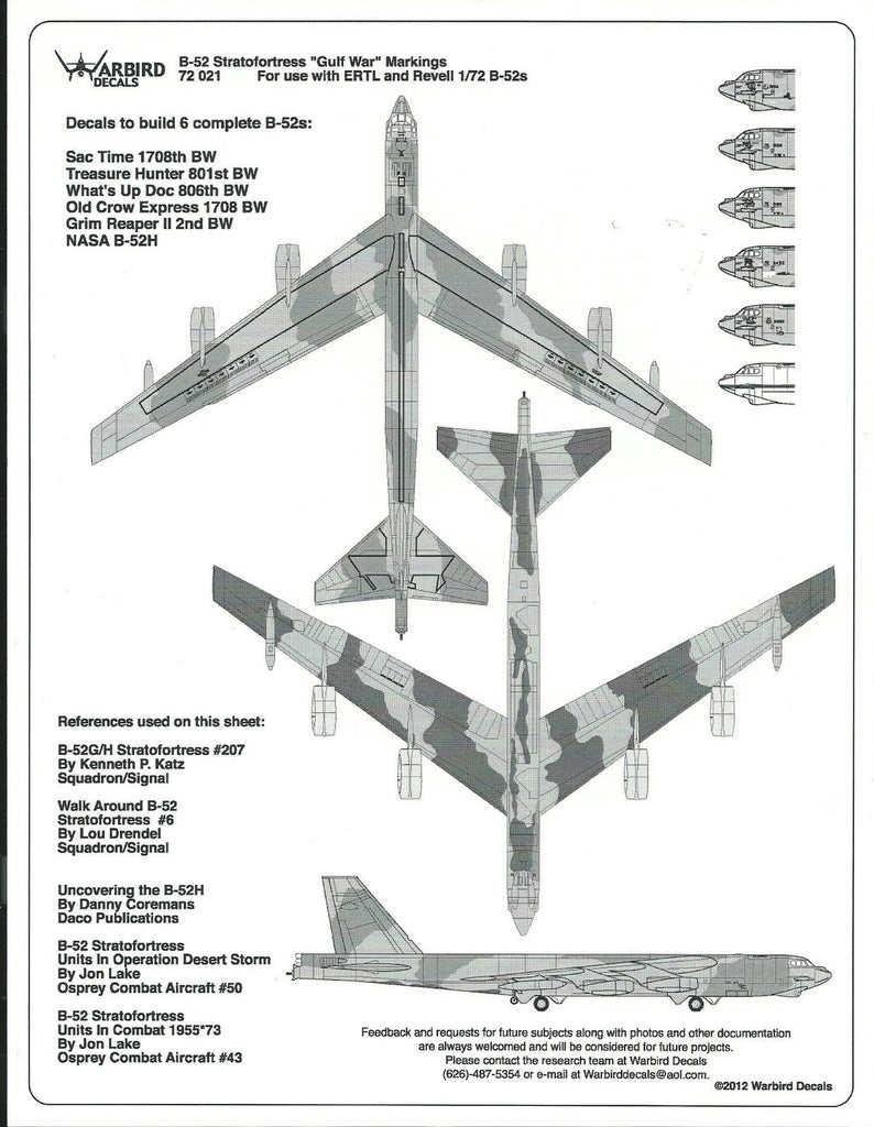 Warbird Decals 72 021. Poly-bagged; zip-locked. Six option markings for Gulf War B-52s and the all white NASA B-52. Excellent subjects. Rare sheet. The decals are of high quality! Please look closely at the aircraft names in the images. Offers some very colorful nose art.