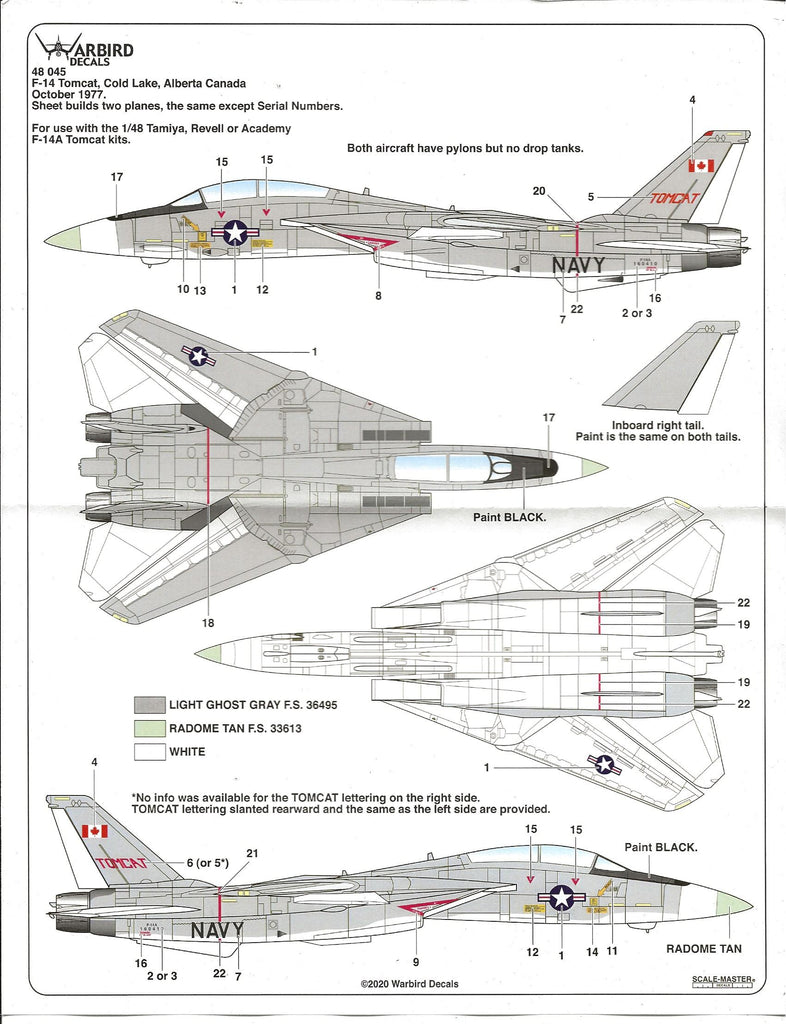 Warbird Decals 48 045. Polybagged; ziplocked. Offers two aircraft options for aircraft parked at Cold Lake, Alberta by the US Navy. They were used to lure government interest in the F-14 in 1977. See scans for details.