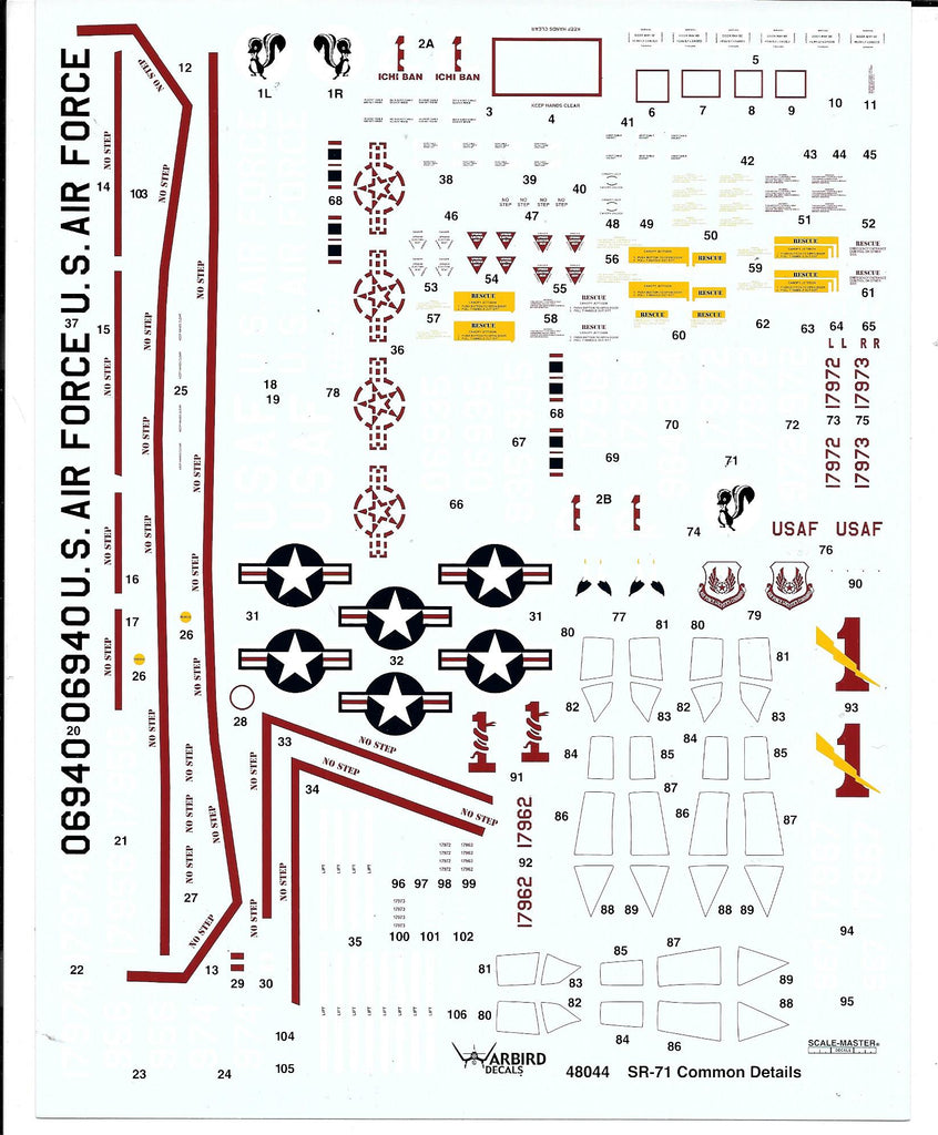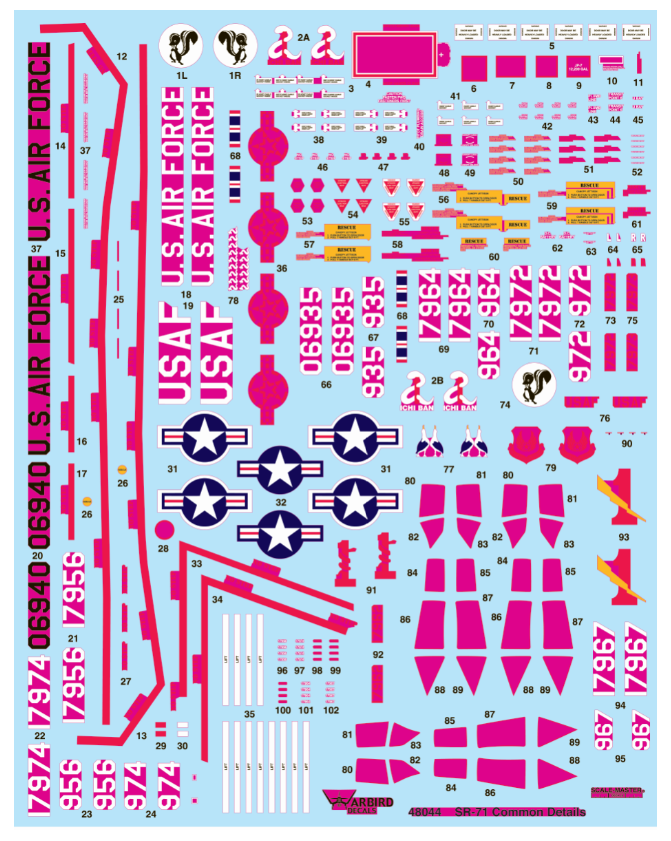 Warbird Decals 48044.  Hot item!  Contents polybagged.  Excellent quality decals.   See scans for details.  Includes varied insignias and plenty of data/ stencils common to the SR-71.  The modeler will have to do the research on what is actually needed for their specific aircraft.  Includes USAF in white and black.  Also includes red trim around the canopy which would be difficult to paint even with masks.  Fitted for the Testors kit.  Note:  White is hard to scan.  I included the artist's copy (pink is clear) so the purchaser can see the white.